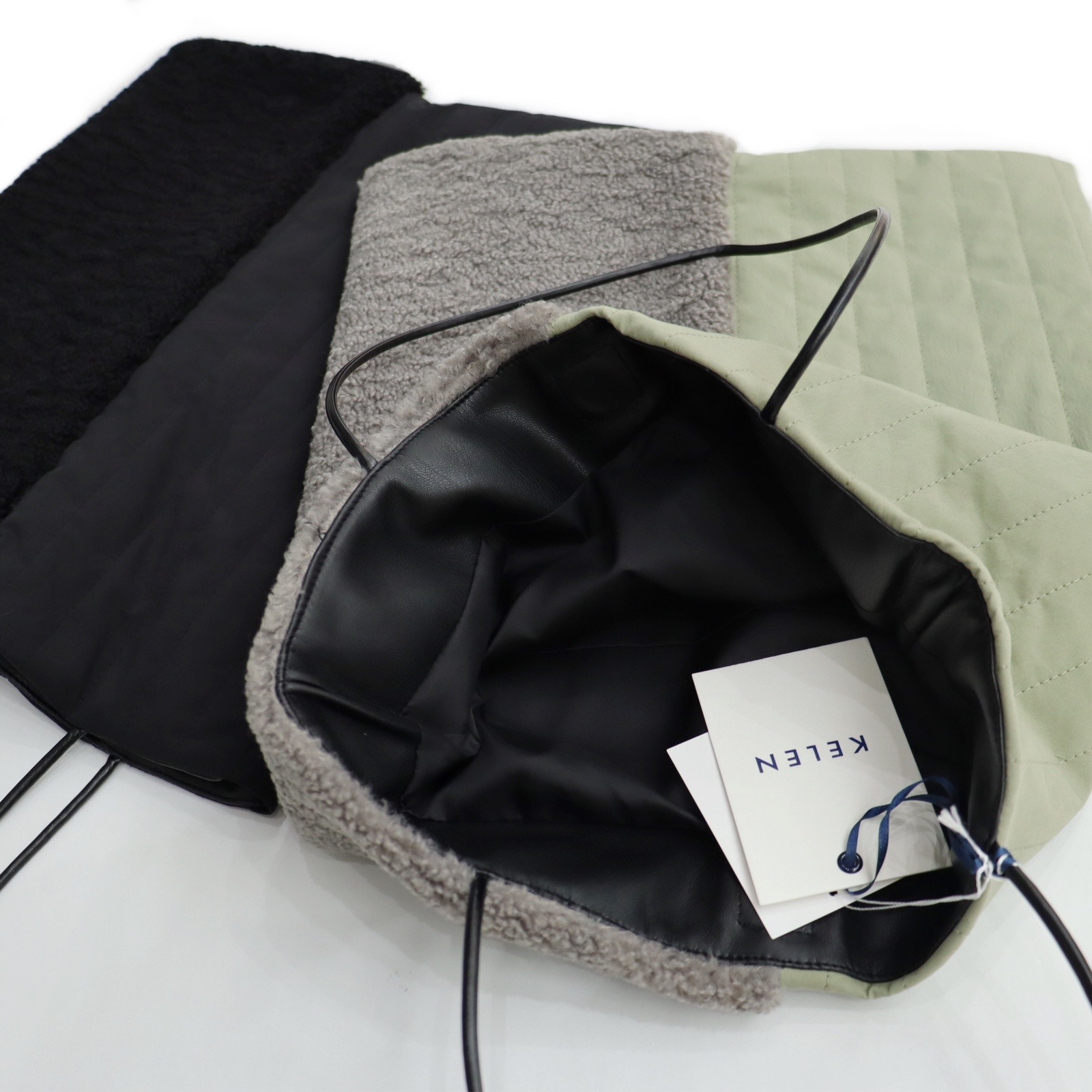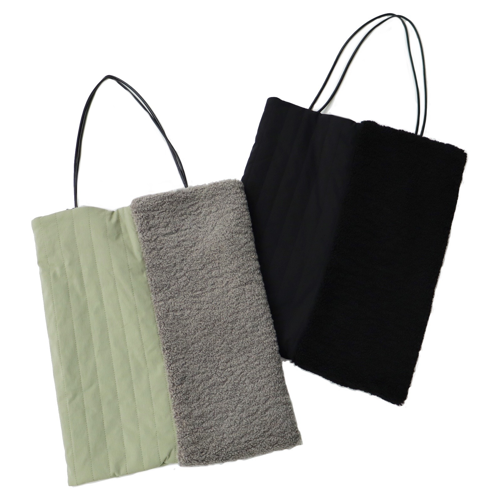 キルティング生地とボア生地を組み合わせた遊びゴコロのある2トーン。ハンドルはレザーライクで柔らかくしなやかな素材で肩からかけられる長さがあります。A4サイズのファイルが入る大きさがあり、内ポケット、バッグ開口部には自然に閉じやすいようマグネットが入っています。
