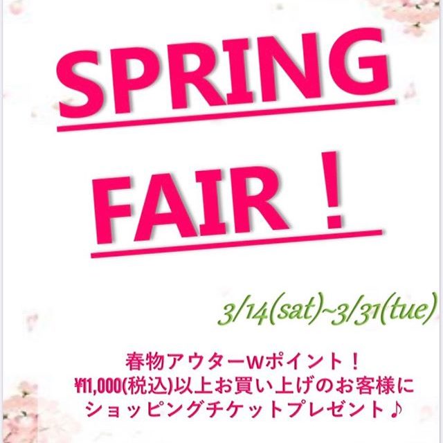 ..【Spring Fair】.3月14(土)〜31(火)スプリングフェアを開催致します!.春のアウターをご購入のお客様にWポイントプレゼント♡♡.また税込¥11,000-以上お買上げ頂いたお客様に次回から使えるショッピングチケットをプレゼ...