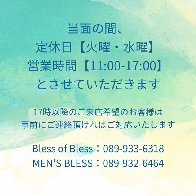 LADYS 【お知らせ】いつもブレスをご利用頂き誠にありがとうございます。 – from Instagram 【お知らせ】いつもブレスをご利用頂き誠にありがとうございます。新型コロナウイルス感染拡大防止のため当面の間、営業時間短縮・定休日を追加致します。水曜定休 → 火・水曜定休10:00-19-00 → 11:00-17:00ご迷惑をおかけ致し... 2020.04.11 KASHIYAMA&MENSLADYSNEWS